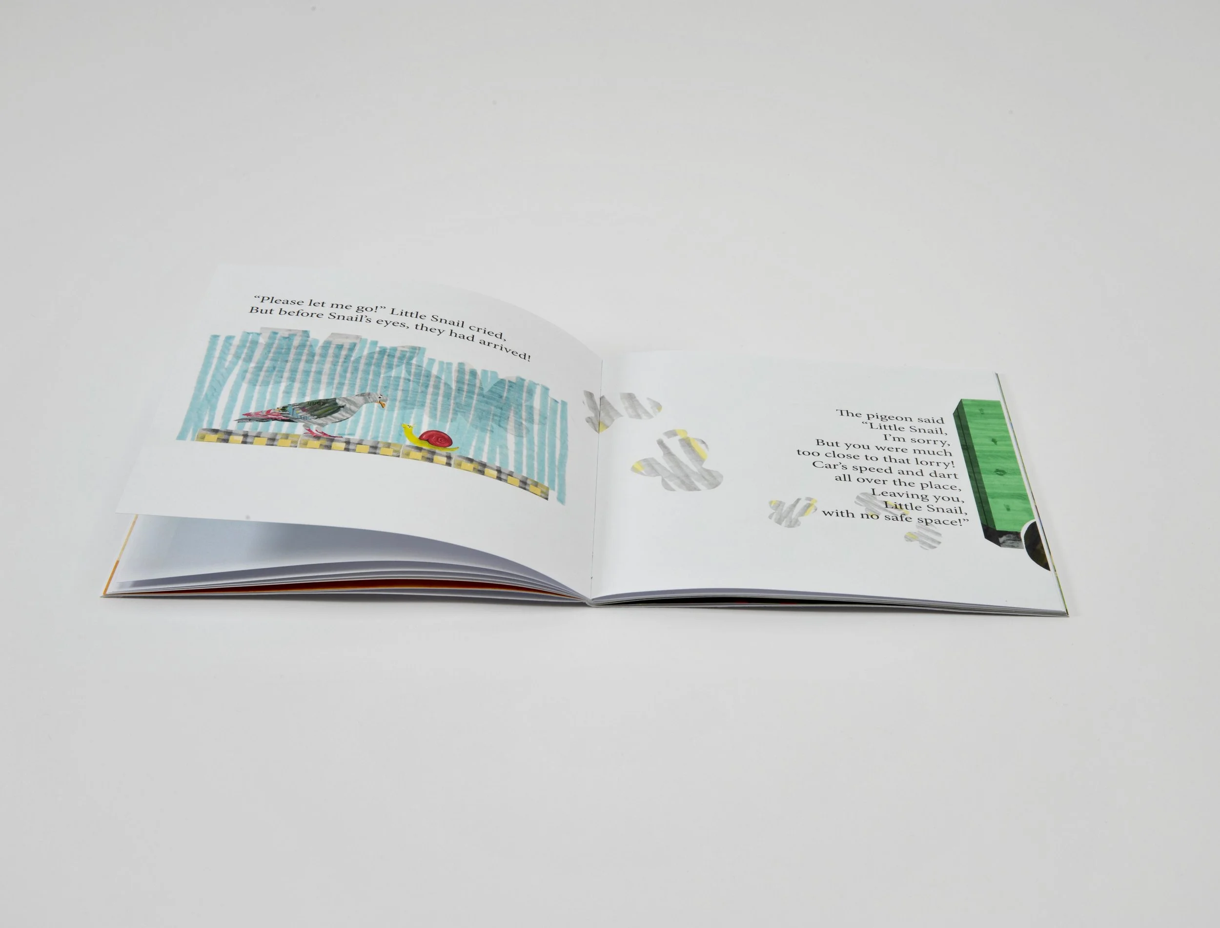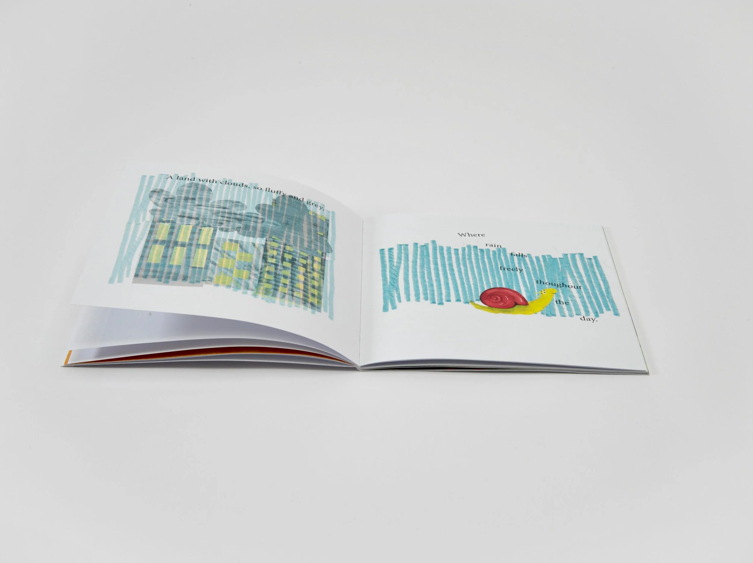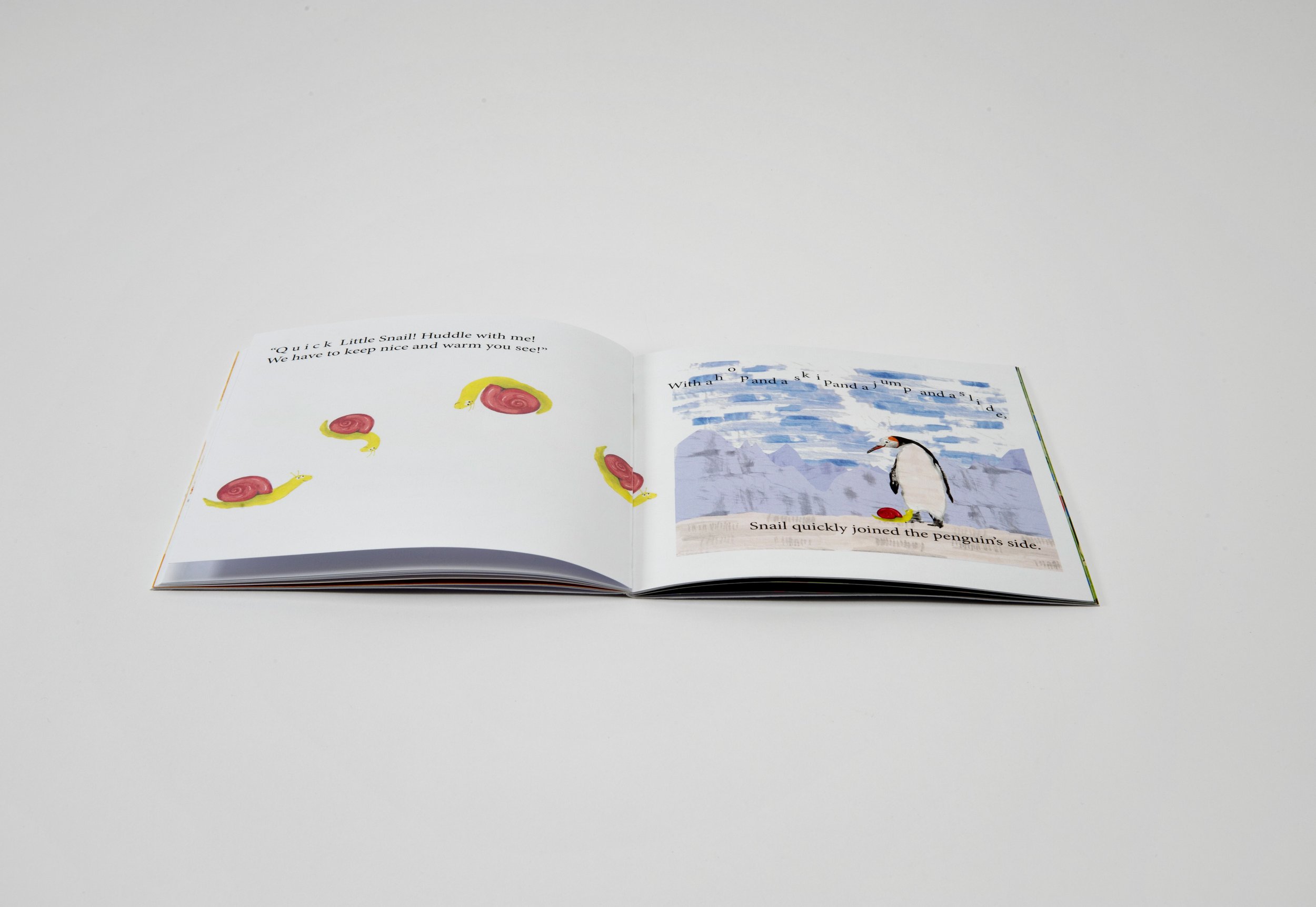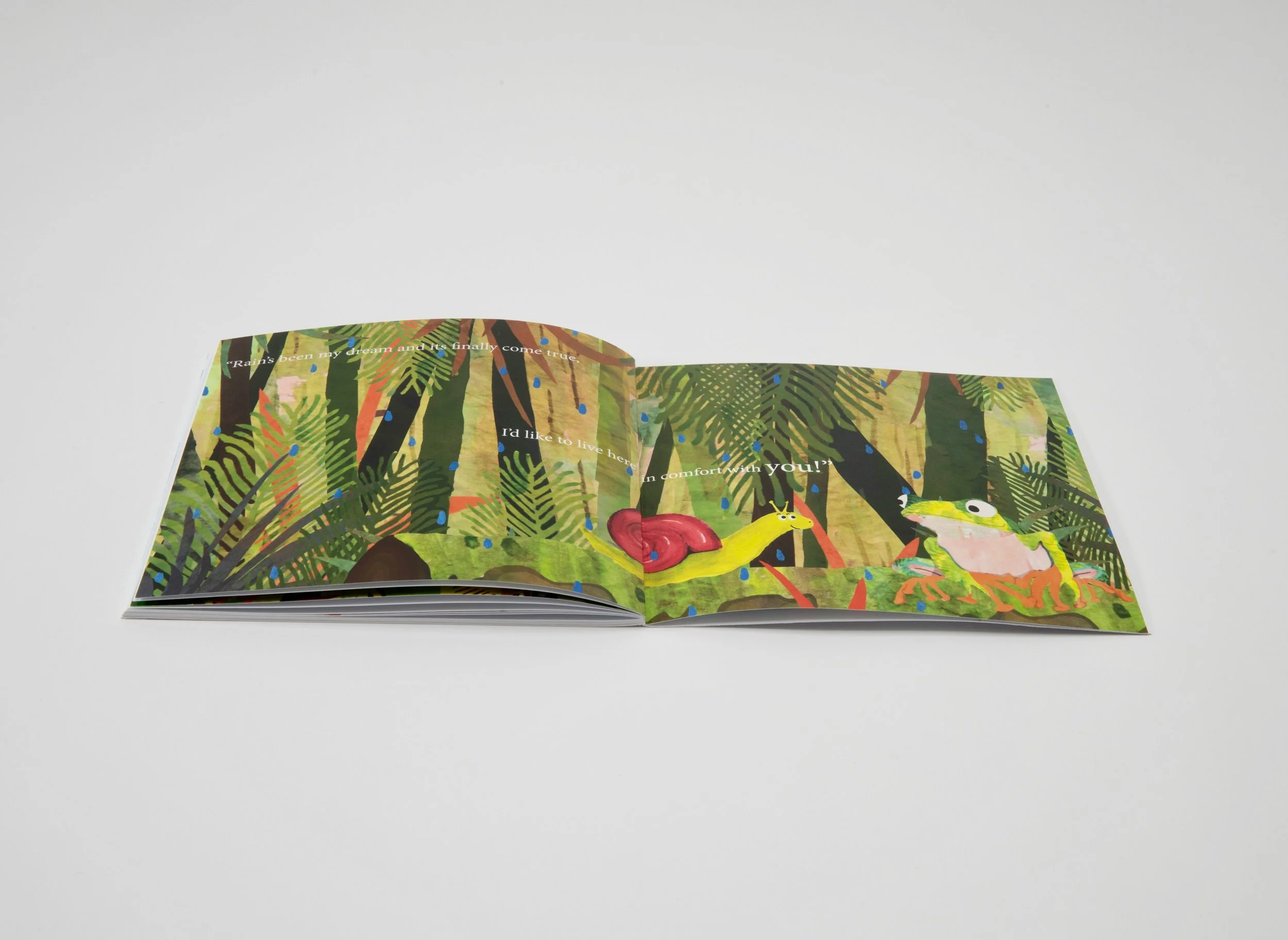 A fully collaged children's story book, about a Snail's journey to finding rain. This story follows a little snail who travels between climates, meeting different characters along the way in the search for rain.